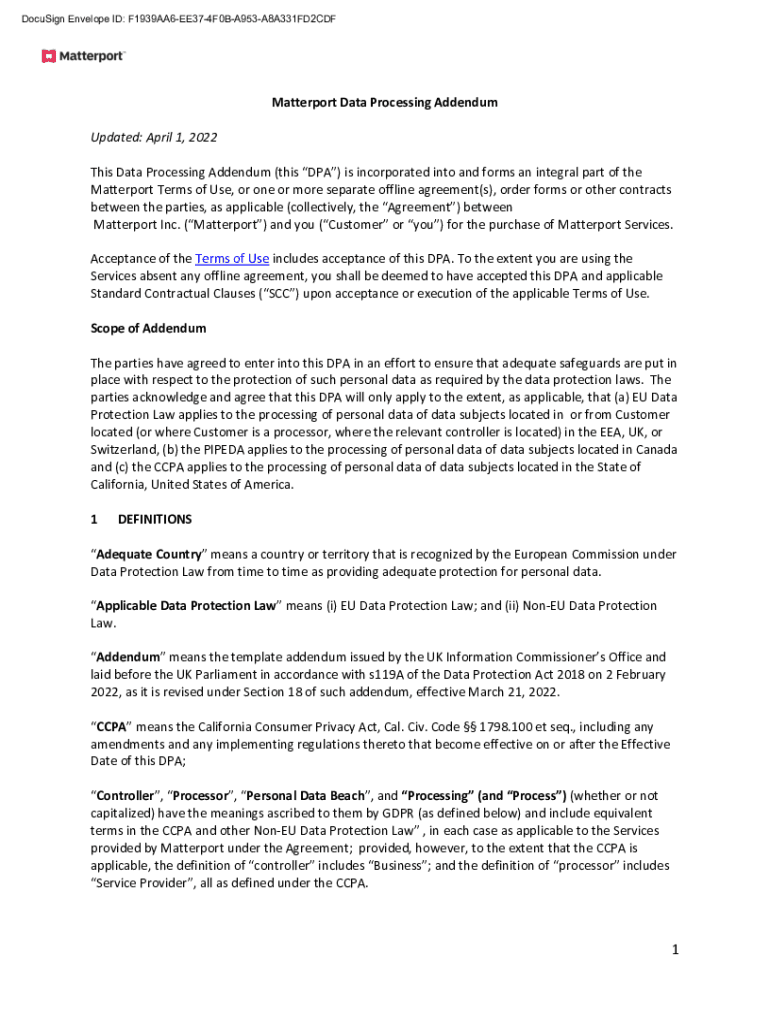 DocuSign Envelope ID: F1939AA6EE374F0BA953A8A331FD2CDFMatterport Data Processing Addendum Updated: April 1, 2022, This Data Processing Addendum (this DPA) is incorporated into and forms an integral
