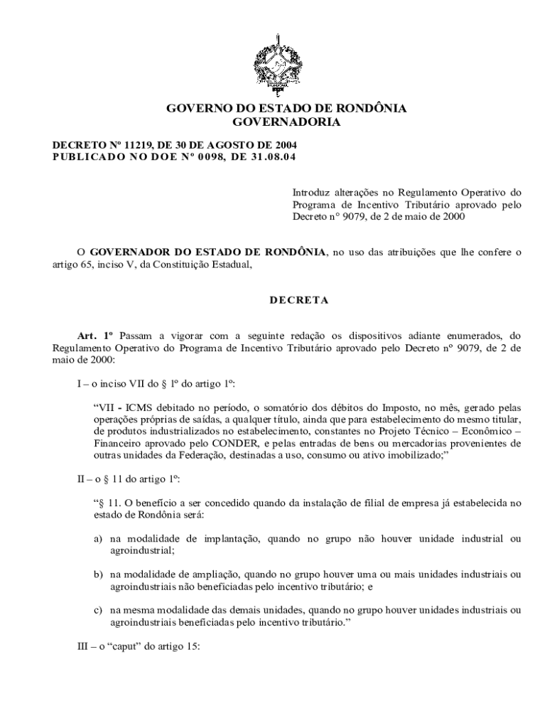 Este decreto modifica o Regulamento Operativo do Programa de Incentivo Tributário, aprovado pelo Decreto nº 9079, de 2 de maio de 2000, estabelecendo novas diretrizes e requisitos para a concessão