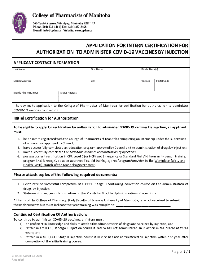 College of Pharmacists of Manitoba 200 Each Avenue, Winnipeg, Manitoba R2H 1A7 Phone (204) 2331411 | Fax: (204) 2373468 Email: info@cphm.ca | Website: www.cphm.caAPPLICATION FOR INTERN CERTIFICATION