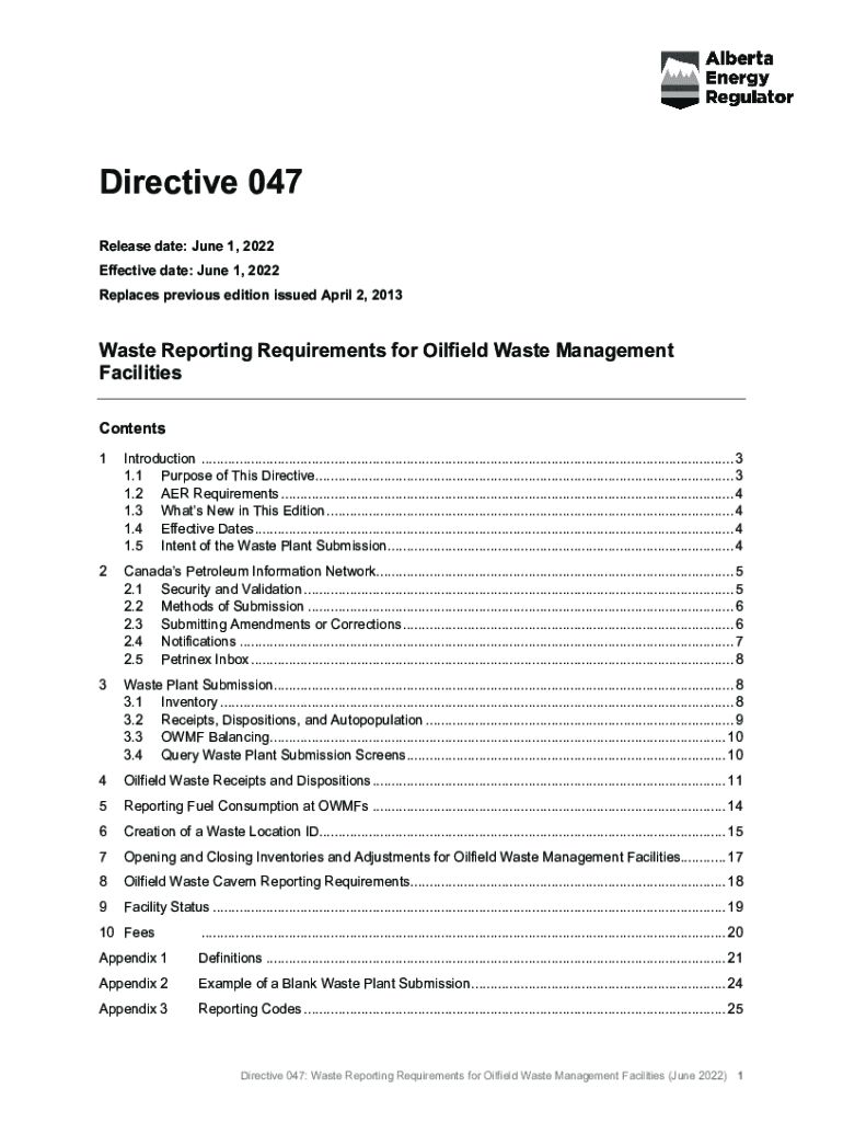 Directive 047 Release date: June 1, 2022, Effective date: June 1, 2022, Replaces previous edition issued April 2, 2013Waste Reporting Requirements for Oilfield Waste Management Facilities Contents