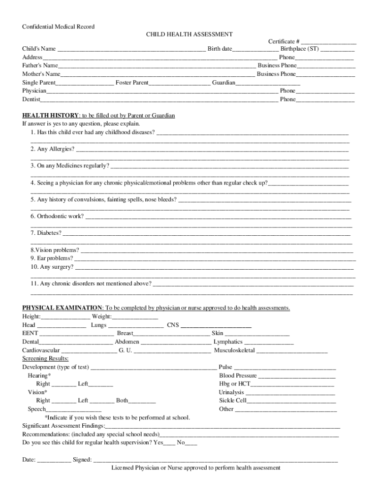 Confidential Medical Record CHILD HEALTH ASSESSMENT Certificate # ___ Child\'s Name ___ Birth date___ Birthplace (ST) ___ Address___ Phone___ Father\'s Name___ Business Phone___ Mother\'s Name___