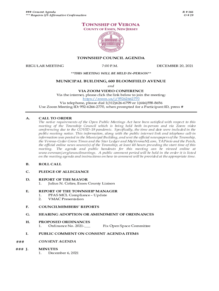 ### Consent Agenda *** Requires 2/3 Affirmative Confirmation # 166 O # 29TOWNSHIP COUNCIL AGENDA REGULAR MEETING7:00 P.M.DECEMBER 20, 2021**THIS MEETING WILL BE HELD UNPERSON**MUNICIPAL BUILDING,