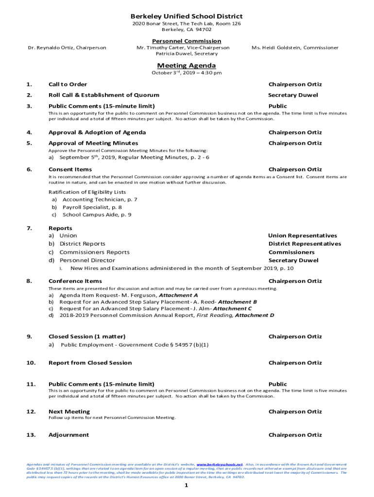 Berkeley Unified School District 2020 Boar Street, The Tech Lab, Room 126 Berkeley, CA 94702Personnel Commission Dr. Reynaldo Ortiz, Chairperson Mr. Timothy Carter, ViceChairperson Patricia Duel,