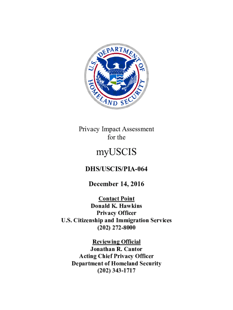 Privacy Impact Assessment for themyUSCIS DHS/USCIS/PIA064 December 14, 2016, Contact Point Donald K. Hawkins Privacy Officer U.S. Citizenship and Immigration Services (202) 2728000 Reviewing Official