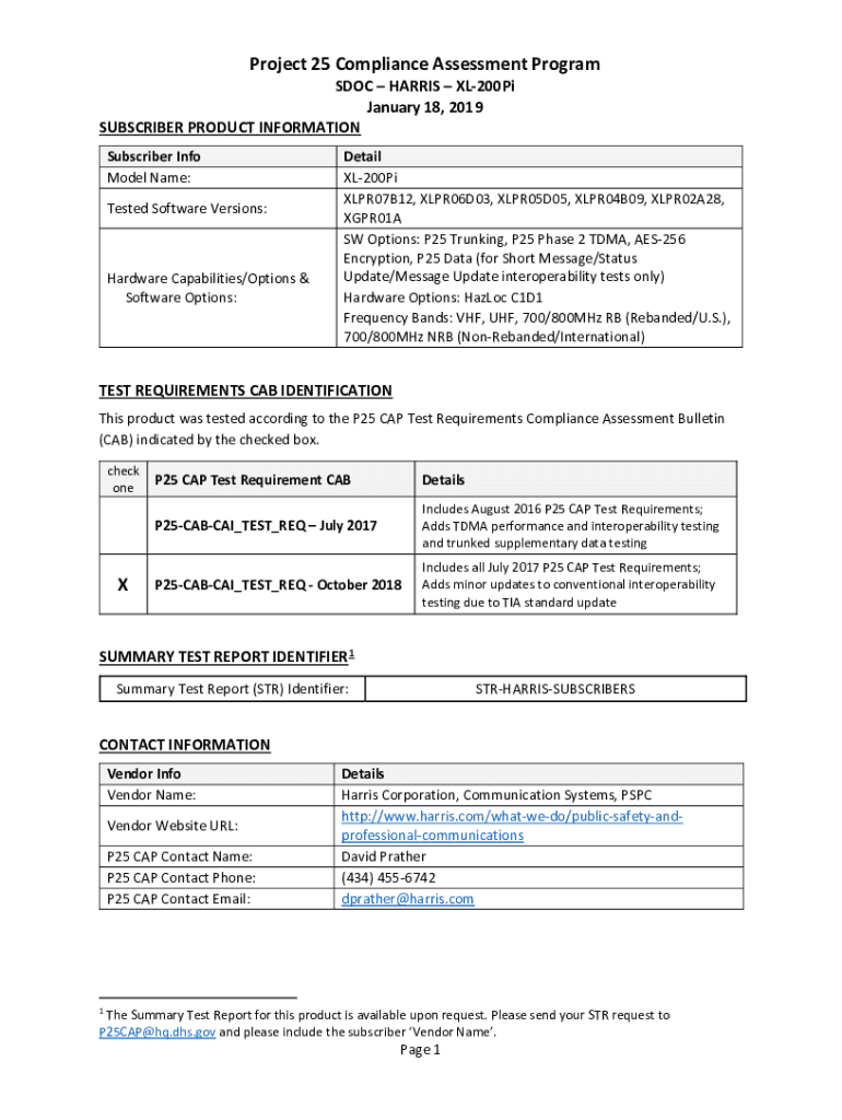 Project 25 Compliance Assessment Programs DOC HARRIS XL200Pi January 18, 2019, SUBSCRIBER PRODUCT INFORMATION Subscriber Info Model Name: Tested Software Versions:Hardware Capabilities/Options & Software