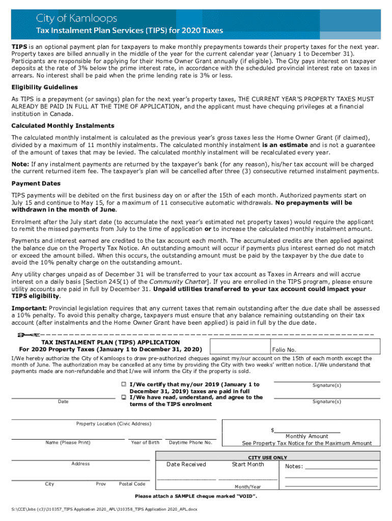 Get the free Tax Installment Plan Services (TIPS) Application for 2023 Taxes - Kamloops