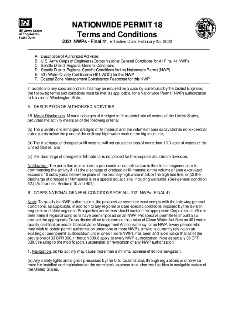 NATIONWIDE PERMIT 18 Terms and Conditions 2021 NPS Final 41; Effective Date: February 25, 2022, A. B. C. D. E. F. Description of Authorized Activities U.S. Army Corps of Engineers (Corps) National