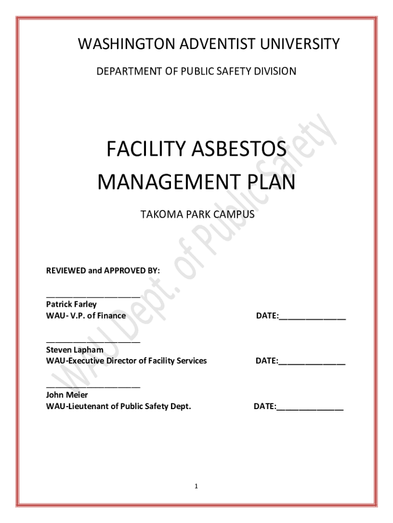 WASHINGTON ADVENTIST UNIVERSITY DEPARTMENT OF PUBLIC SAFETY DIVISIONFACILITY ASBESTOS MANAGEMENT PLAN TACOMA PARK CAMPUSREVIEWED and APPROVED BY: ___ Patrick Farley WAS V.P. of Finance DATE:______