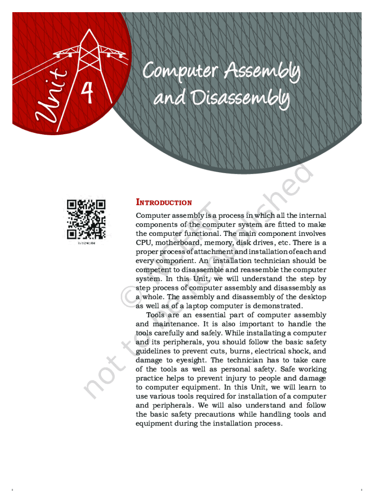 Unit4Computer Assembly and DisassemblyIntroduction Computer assembly is a process in which all the internal components of the computer system are fitted to make the computer functional. The main component