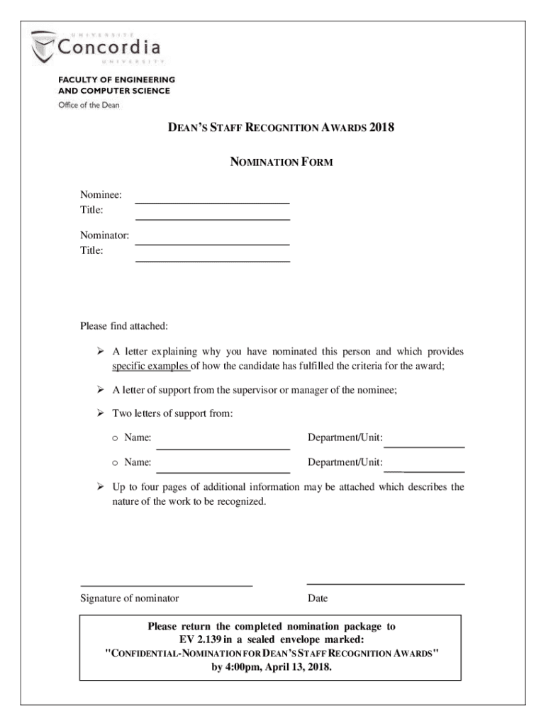 DEANS STAFF RECOGNITION AWARDS 2018 NOMINATION FORM Nominee: Title: Nominator: Title:Please find attached: A letter explaining why you have nominated this person and which provides specific examples