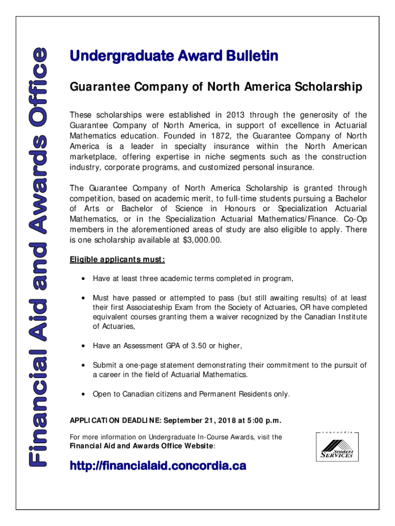 Undergraduate Award Bulletin Guarantee Company of North America Scholarship These scholarships were established in 2013 through the generosity of the Guarantee Company of North America, in support