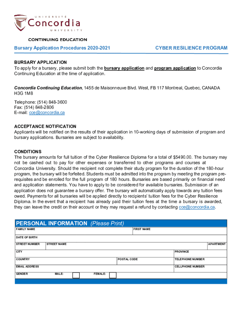 Bursary Application Procedures 20202021CYBER RESILIENCE PROGRAMBURSARY APPLICATION To apply for a bursary, please submit both the bursary application and program application to Concordia Continuing