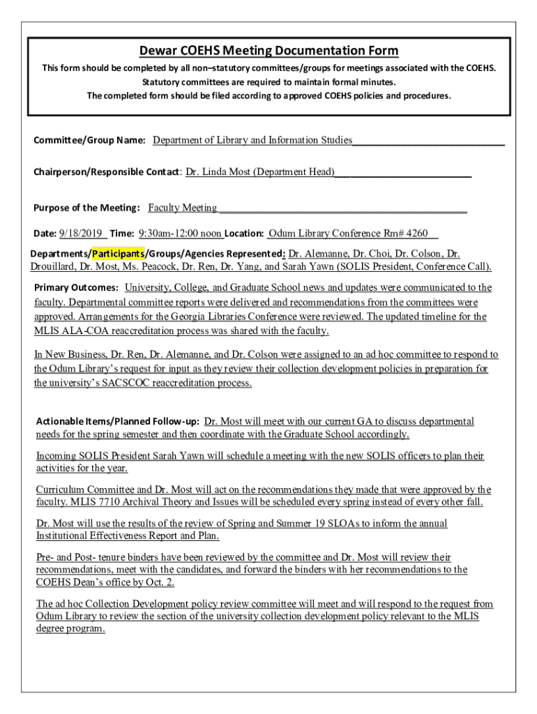Dewar COEDS Meeting Documentation Form This form should be completed by all nonstatutory committees/groups for meetings associated with the COEDS. Statutory committees are required to maintain formal