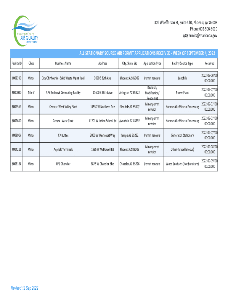 301 W Jefferson St, Suite 410, Phoenix, AZ 85003 Phone 6025066010 AQPermits@maricopa.govALL STATIONARY SOURCE AIR PERMIT APPLICATIONS RECEIVED WEEK OF SEPTEMBER 4, 2022, Facility IDClassBusiness NameAddressCity,