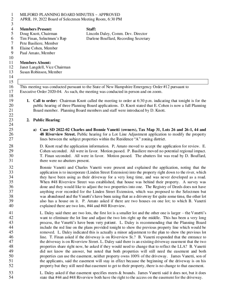 1 2 3 4 5 6 7 8 9 10 11 12 13 14 15 16 17 18 19 20 21 22 23 24 25 26 27MILFORD PLANNING BOARD MINUTES APPROVED APRIL 19, 2022, Board of Selectmen Meeting Room, 6:30 PM Members Present: Doug Knot,