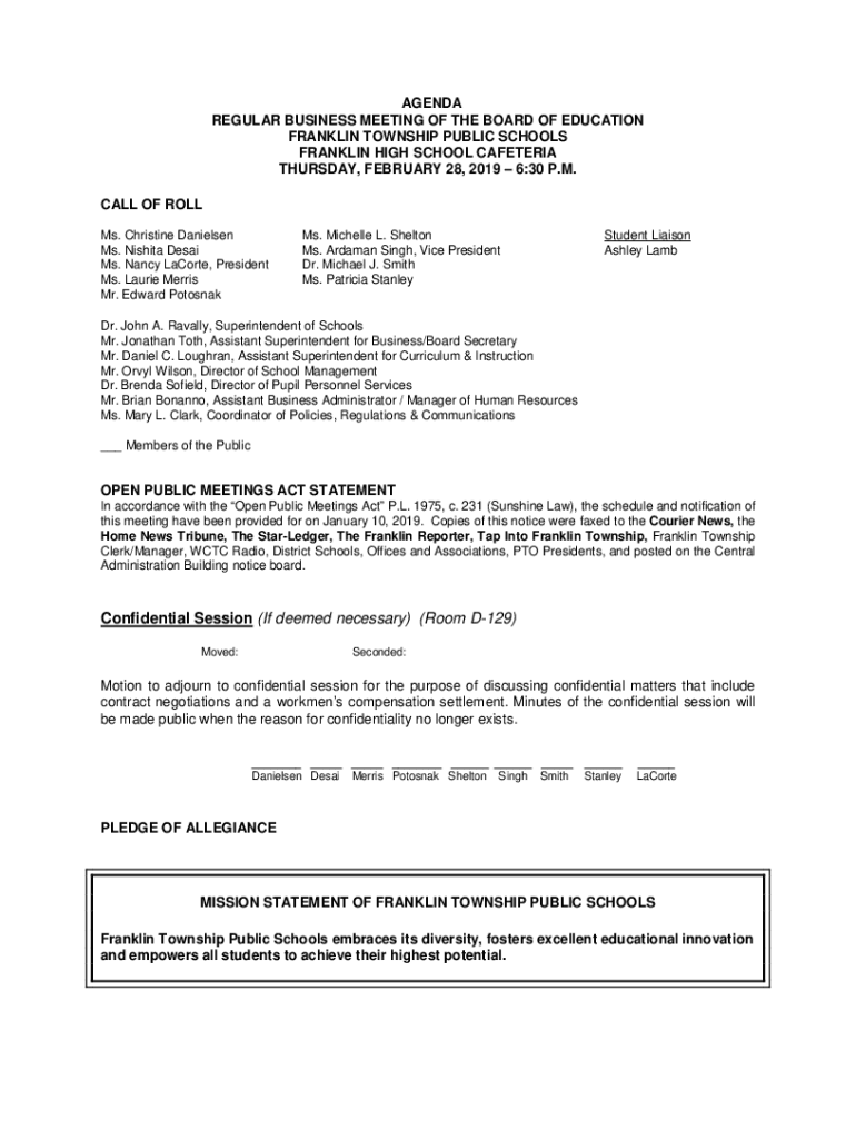 AGENDA REGULAR BUSINESS MEETING OF THE BOARD OF EDUCATION FRANKLIN TOWNSHIP PUBLIC SCHOOLS FRANKLIN HIGH SCHOOL CAFETERIA THURSDAY, FEBRUARY 28, 2019 6:30 P.M. CALL OF ROLL Ms. Christine Daniel sen