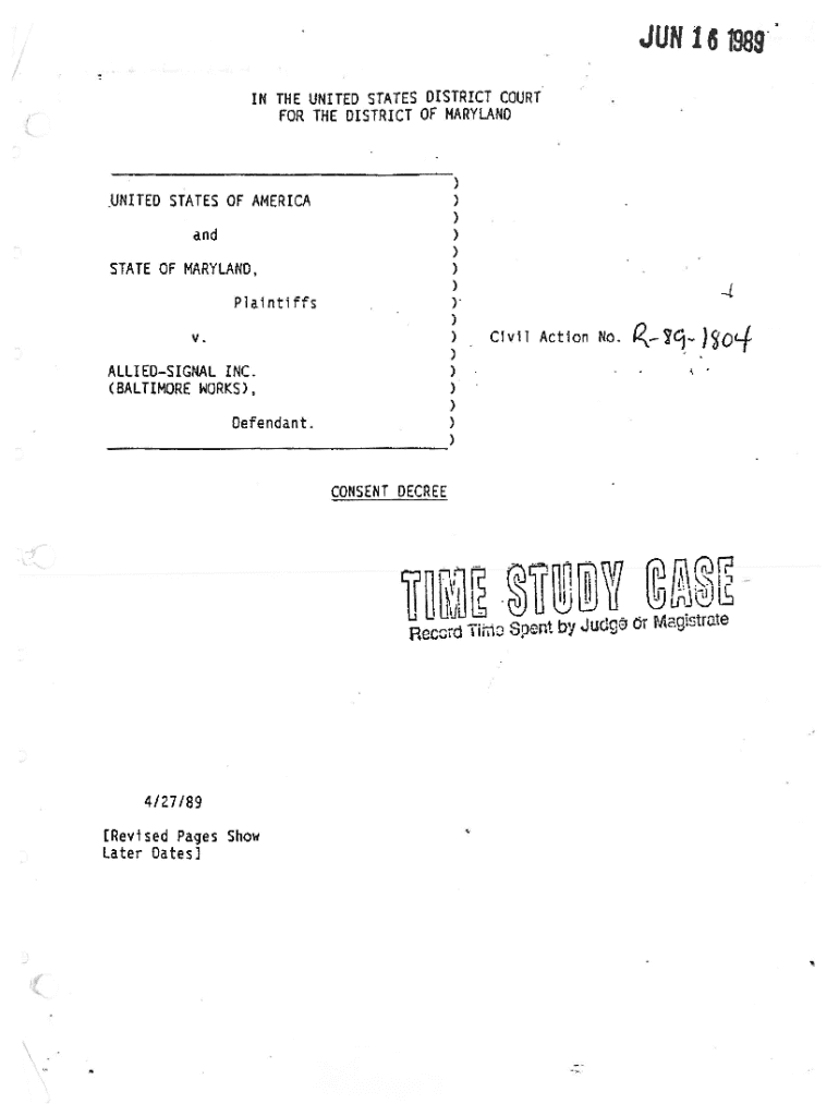 JUN I G1989. I IN THE UNITED STATES DISTRICT Court FOR THE DISTRICT OF MARYLAND))))))).UNITED STATES OF AMERICA and STATE OF MARYLAND Plaintiffs.)v.ALLIEDSIGNAL INC. (BALTIMORE WORKS) ___ Defendant.)