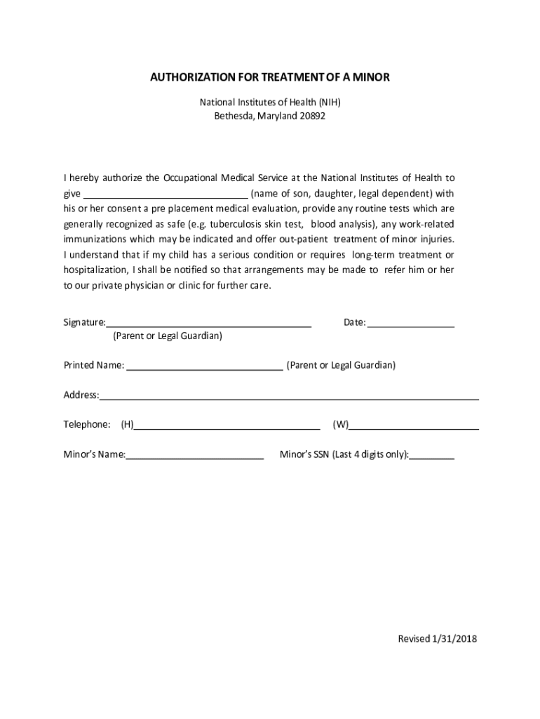 AUTHORIZATION FOR TREATMENT OF A MINOR National Institutes of Health (NIH) Bethesda, Maryland 20892I hereby authorize the Occupational Medical Service at the National Institutes of Health to give