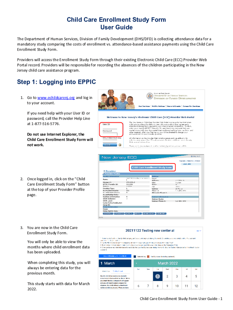 Child Care Enrollment Study Form User Guide The Department of Human Services, Division of Family Development (DHS/DID) is collecting attendance data for a mandatory study comparing the costs of enrollment