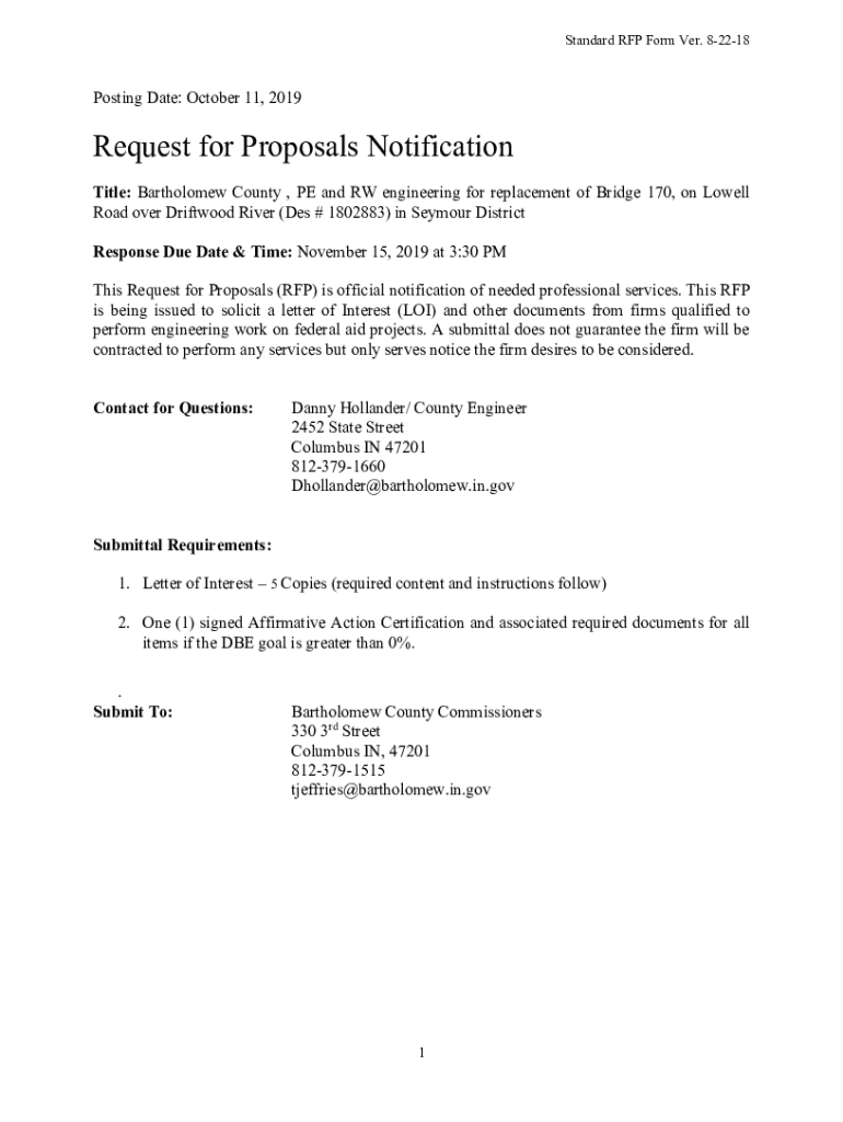 Standard RFP Form Very. 82218Posting Date: October 11, 2019Request for Proposals Notification Title: Bartholomew County, PE and RAW engineering for replacement of Bridge 170, on Lowell Road over Driftwood