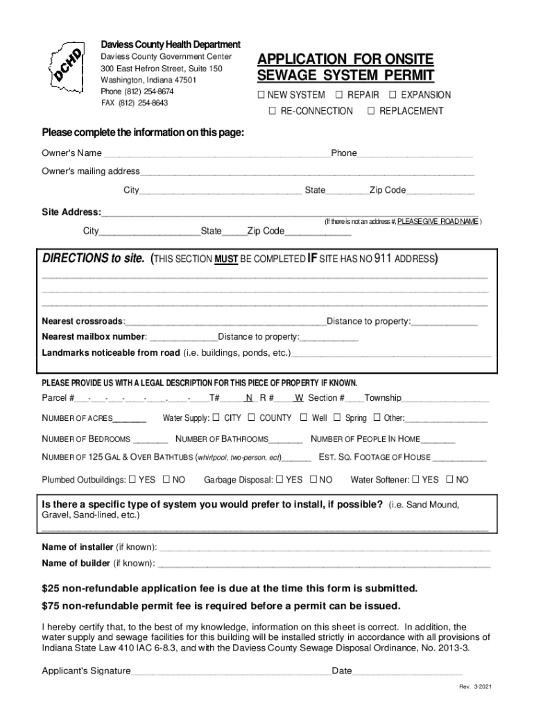 Davies's County Health Department Davies's County Government Center 300 East Heron Street, Suite 150 Washington, Indiana 47501 Phone (812) 2548674 FAX (812) 2548643APPLICATION FOR ONSITE SEWAGE SYSTEM
