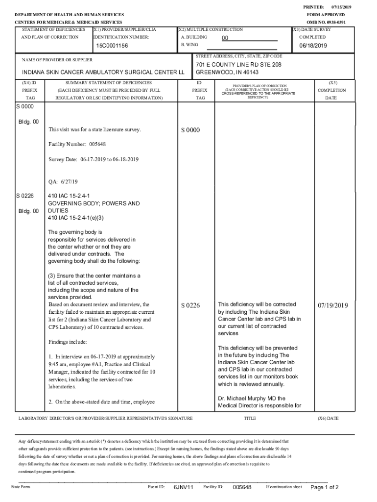 PRINTED: DEPARTMENT OF HEALTH AND HUMAN SERVICES CENTERS FOR MEDICARE & MEDICAID SERVICES STATEMENT OF DEFICIENCIES(X1) PROVIDER/SUPPLIER/LIGAND PLAN OF CORRECTIONIDENTIFICATION NUMBER:15C000115607/15/2019FORM