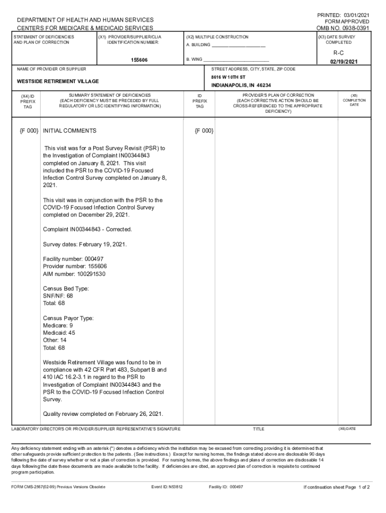 PRINTED: 03/01/2021 FORM APPROVEDDEPARTMENT OF HEALTH AND HUMAN SERVICES CENTERS FOR MEDICARE & MEDICAID SERVICES STATEMENT OF DEFICIENCIES AND PLAN OF CORRECTION(X1) PROVIDER/SUPPLIER/CIA IDENTIFICATION
