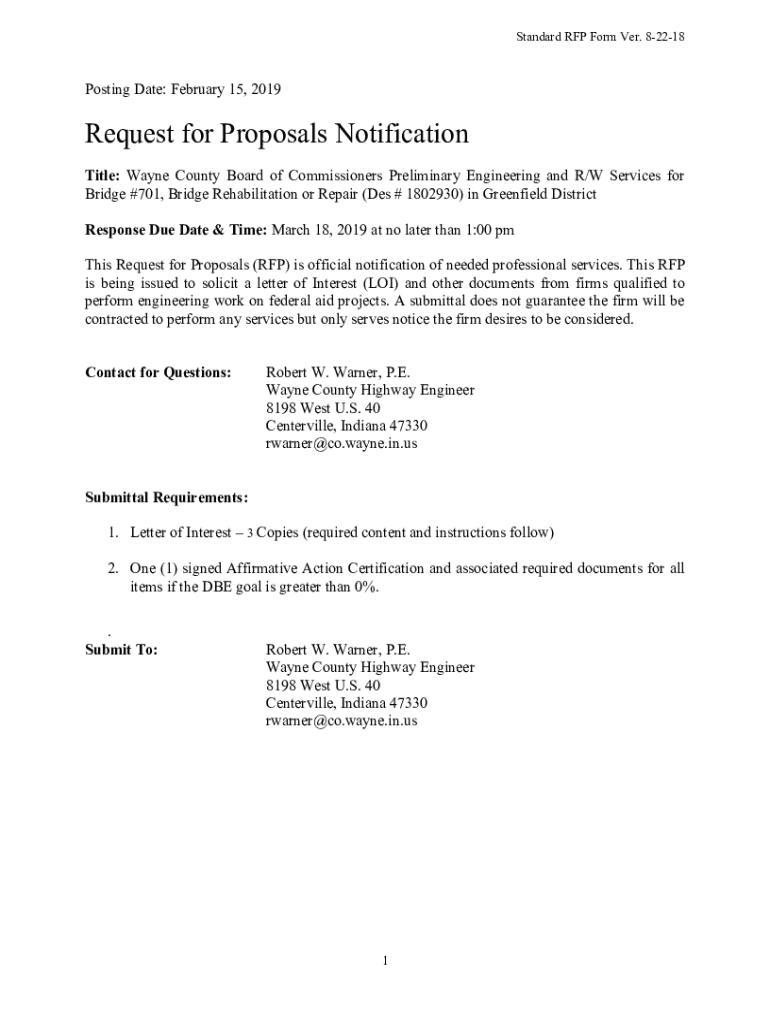 Standard RFP Form Very. 82218Posting Date: February 15, 2019Request for Proposals Notification Title: Wayne County Board of Commissioners Preliminary Engineering and R/W Services for Bridge #701,