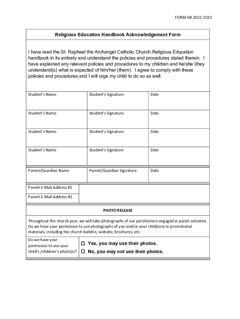 FORM HE 20222023Religious Education Handbook Acknowledgement Form I have read the St. Raphael the Archangel Catholic Church Religious Education handbook in its entirety and understand the policies
