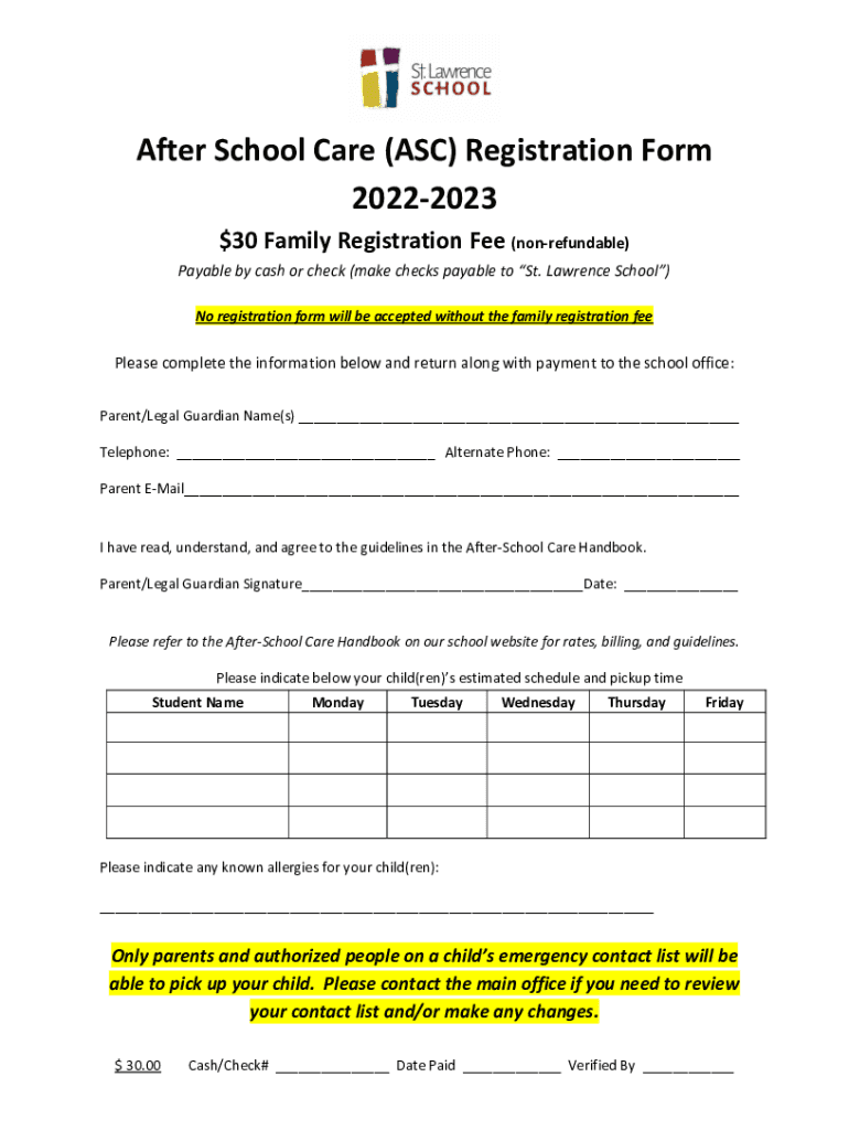 After School Care (ASC) Registration Form $2022202330 Family Registration Fee (nonrefundable) Payable by cash or check (make checks payable to St. Lawrence School) No registration form will be accepted