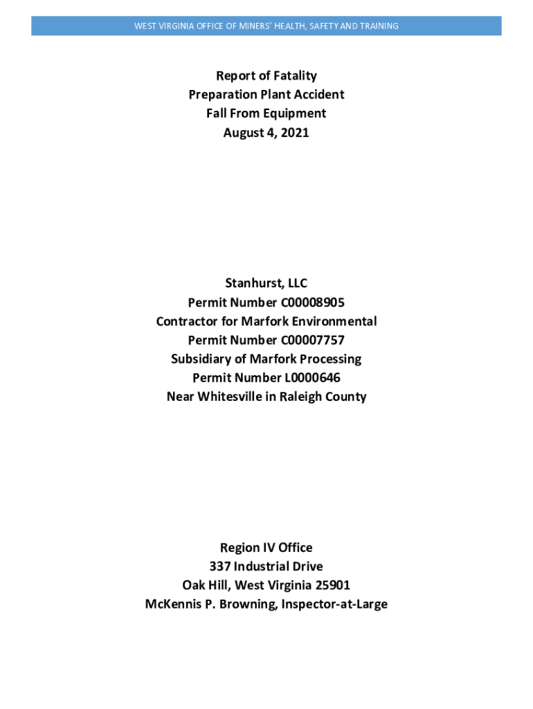Get the free Report of Fatality Preparation Plant Accident Fall From Equipment ...