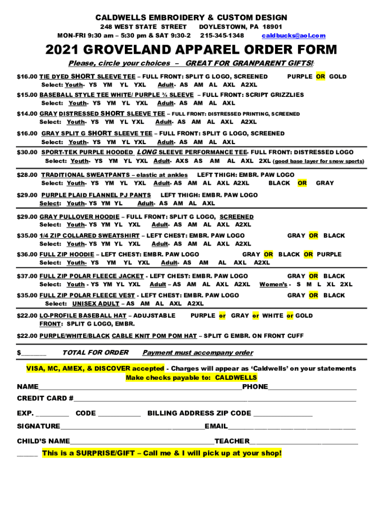 CALDWELL EMBROIDERY & CUSTOM DESIGN 248 WEST STATE STREET MONERA 9:30 am 5:30 pm & SAT 9:302DOYLESTOWN, PA 18901 2153451348 caldbucks@aol.com2021 GROVEL AND APPAREL ORDER FORM Please, circle your