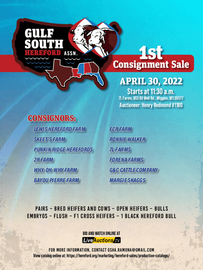 Starts at 11:30 a.m.7L Farms, 853 Oil Well Rd., Wiggins, MS 39577Auctioneer: Henry Redmond #1180CONSIGNORS: