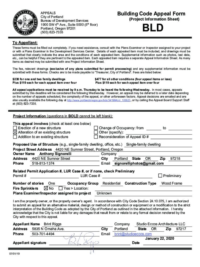Building Code Appeal FormAPPEALS City of Portland Bureau of Development Services 1900 SW 4th Ave., Suite 5000 (5th floor) Portland, Oregon 97201 (503) 8237335(Project Information Sheet)Plato Appellant: