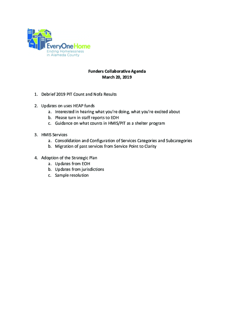 Funders Collaborative Agenda March 20, 2019 1. Debrief 2019 PIT Count and Nova Results 2. Updates on uses HEAP funds a. Interested in hearing what you're doing, what you're excited about b. Please