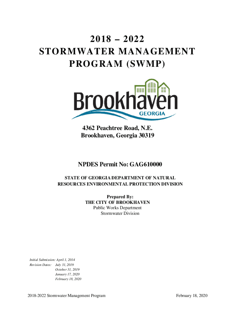 2018 2022 STORMWATER MANAGEMENT PROGRAM (SWAMP)4362 Peach tree Road, N.E. Brookhaven, Georgia 30319NPDES Permit No: GAG610000 STATE OF GEORGIA DEPARTMENT OF NATURAL RESOURCES ENVIRONMENTAL PROTECTION