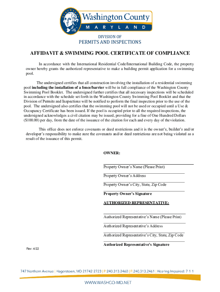 DIVISION PERMITS AND INSPECTIONSAFFIDAVIT & SWIMMING POOL CERTIFICATE OF COMPLIANCE In accordance with the International Residential Code/International Building Code, the property owner hereby grants