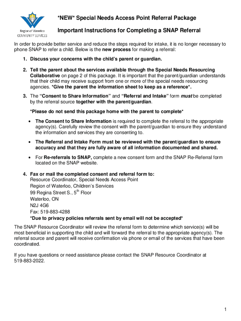 *NEW* Special Needs Access Point Referral Package Important Instructions for Completing a SNAP Referral In order to provide better service and reduce the steps required for intake, it is no longer