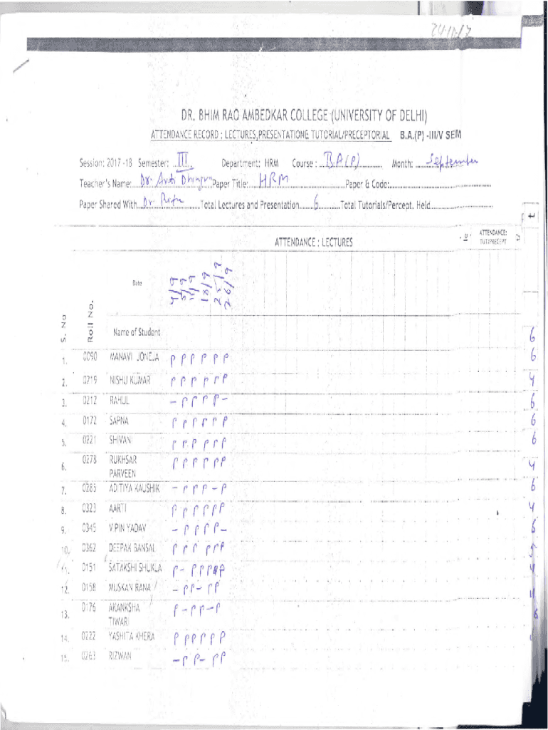 IDR. SHIM RAOAMBEDfAR COLLEGE (UNIVERSITY OF DELHI) LECTURES, PRESENTATION&ATTENDANCE RECORD : Session: 2017 1 8Semester:. Teacher\'s Name: ..... b.1. Department: HRM1lJ+.TP).............. Course: