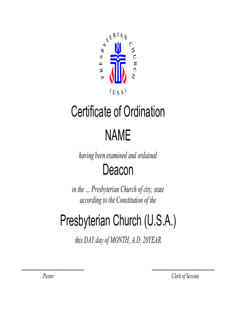 Certificate of Ordination NAME having been examined and ordainedDeacon in the Presbyterian Church of city, state according to the Constitution of the Presbyterian Church (U.S.A.) this DAY of MONTH,