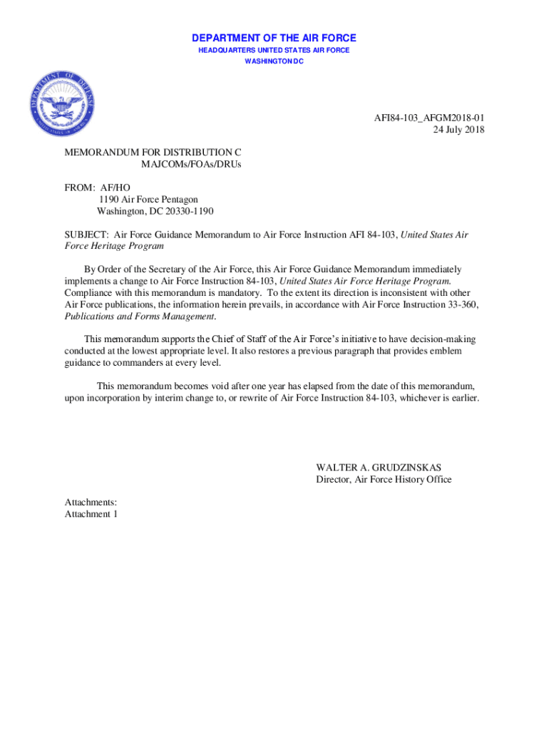 DEPARTMENT OF THE AIR FORCE HEADQUARTERS UNITED STATES AIR FORCE WASHINGTON DCAFI84103_AFGM201801 24 July 2018 MEMORANDUM FOR DISTRIBUTION C Majors/Foam/Drug FROM: AF/HO 1190 Air Force Pentagon Washington,