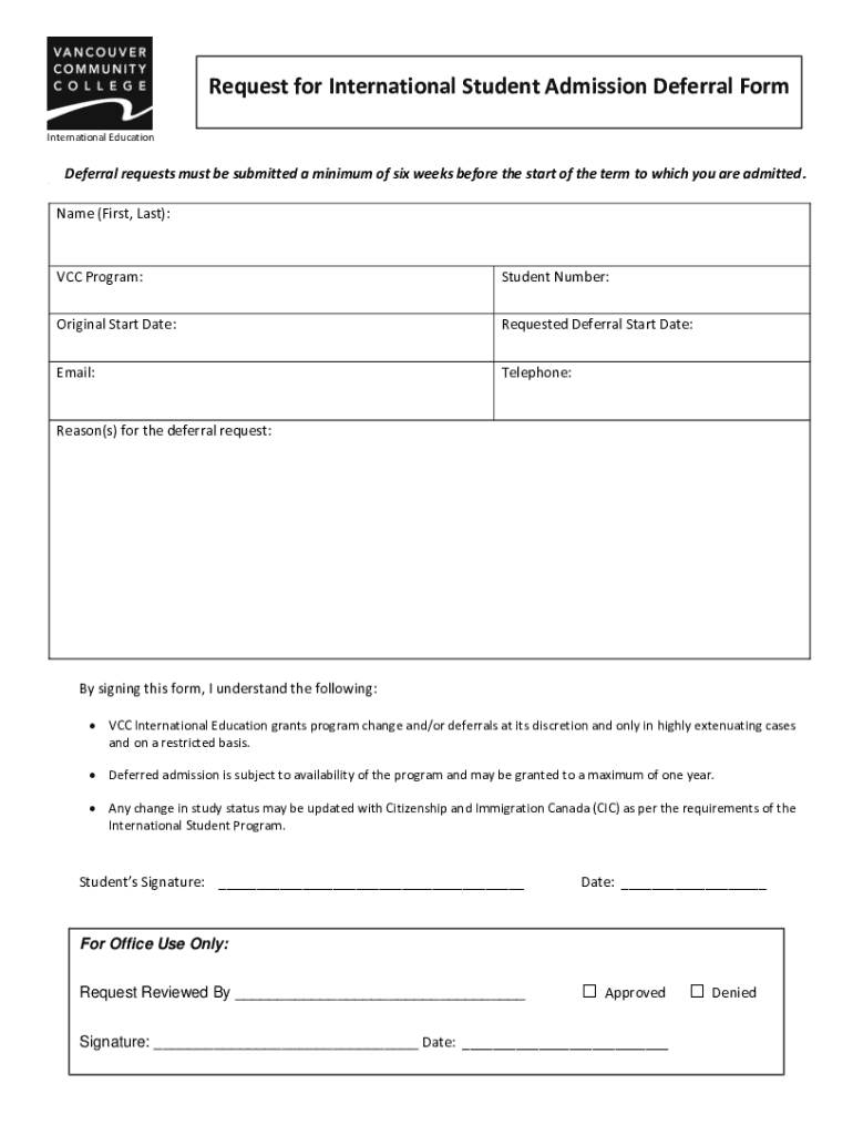 Request for International Student Admission Deferral Form International EducationDeferral requests must be submitted a minimum of six weeks before the start of the term to which you are admitted.