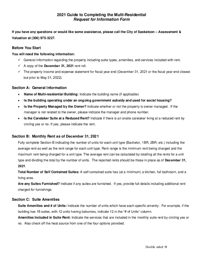 2021 Guide to Completing the MultiResidential Request for Information Form If you have any questions or would like some assistance, please call the City of Saskatoon Assessment & Valuation at (306)
