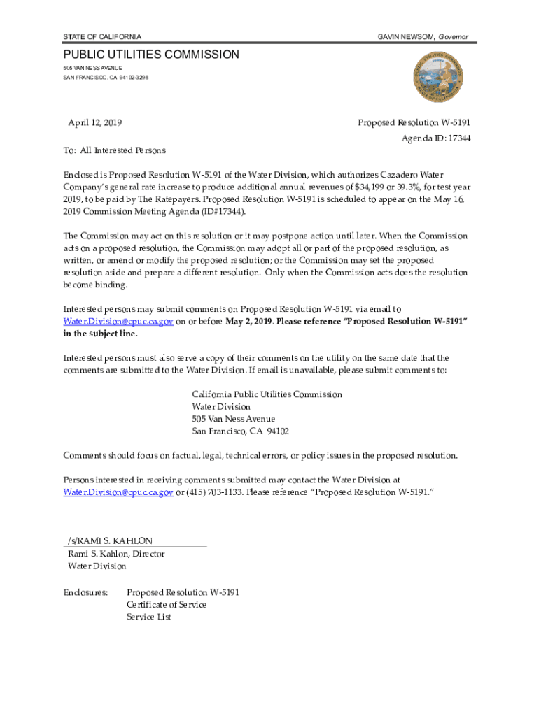 STATE OF CALIFORNIAGAVIN NEWSOM, GovernorPUBLIC UTILITIES COMMISSION 505 VAN LESS AVENUE SAN FRANCISCO, CA 941023298April 12, 2019Proposed Resolution W5191 Agenda ID: 17344To: All Interested Persons