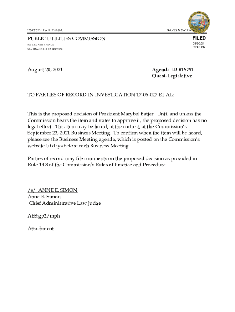 STATE OF CALIFORNIAGAVIN NEWSOM, GovernorPUBLIC UTILITIES COMMISSIONFILED505 VAN LESS AVENUE08/20/21