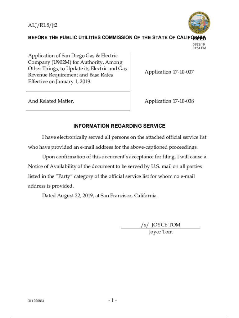 ALJ/RL8/jt2 BEFORE THE PUBLIC UTILITIES COMMISSION OF THE STATE OF CALIFORNIA FILED 08/22/19 01:54 Application of San Diego Gas & Electric Company (U902M) for Authority, Among Other Things, to Update