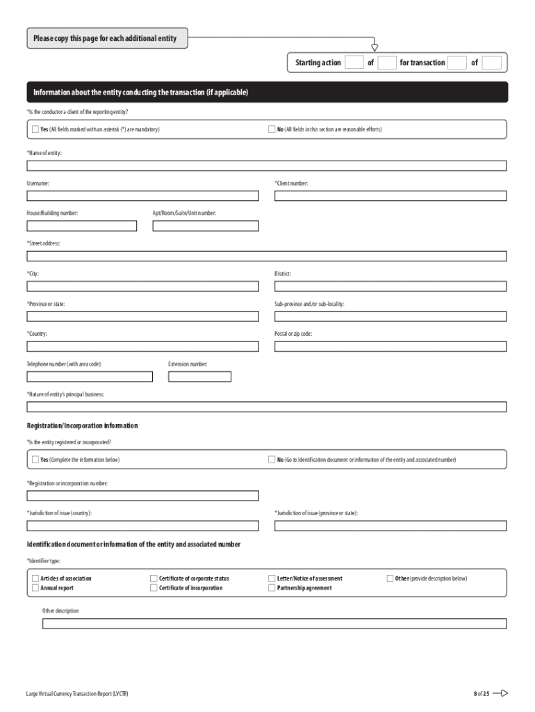 Please copy this page for each additional entity Starting actionoffor transactionofInformation about the entity conducting the transaction (if applicable) *Is the conductor a client of the reporting