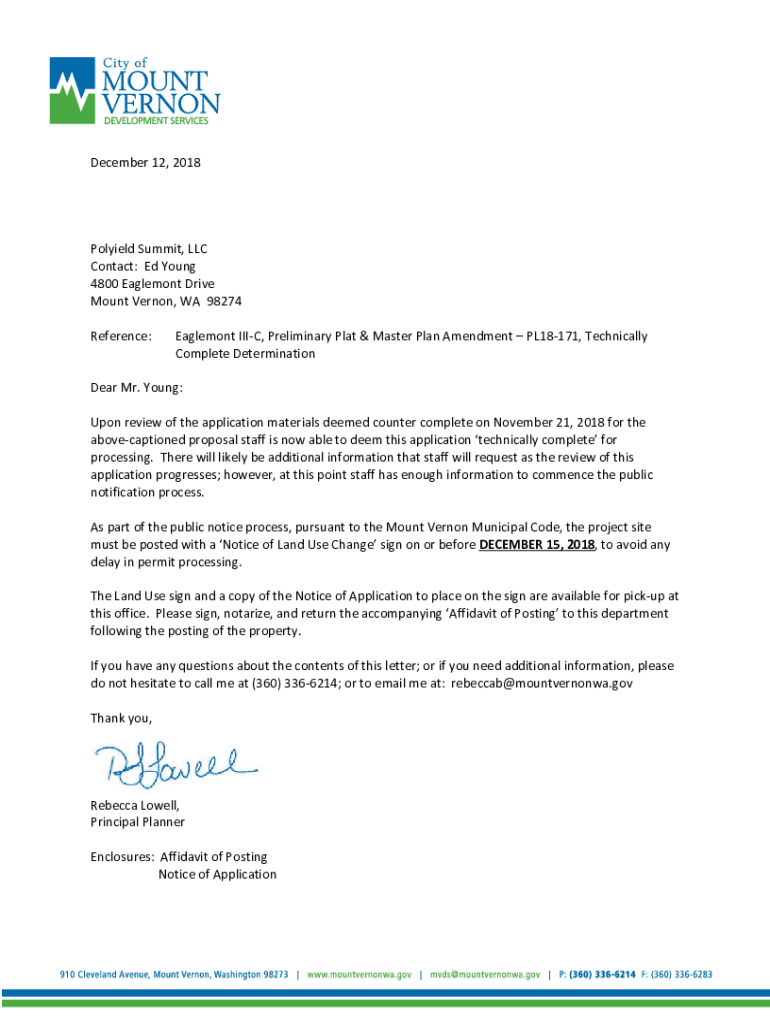 December 12, 2018Polyield Summit, LLC Contact: Ed Young 4800 Element Drive Mount Vernon, WA 98274 Reference:Element AIIC, Preliminary Plat & Master Plan Amendment PL18171, Technically Complete DeterminationDear