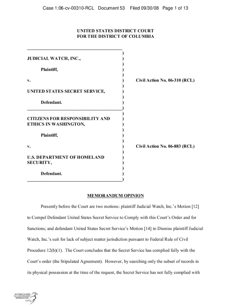 Case 1:06cv00310RCL Document 53Filed 09/30/08-Page 1 of 13UNITED STATES DISTRICT COURT FOR THE DISTRICT OF COLUMBIA ___))) Plaintiff,) ) v.) ) UNITED STATES SECRET SERVICE,) ) Defendant. ) ___)) CITIZENS