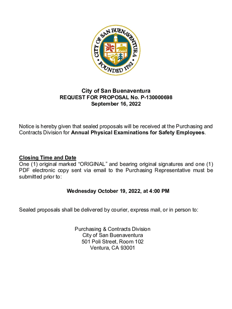 City of San BuenaventuraREQUEST FOR PROPOSAL No. P130000698 September 16, 2022Notice is hereby given that sealed proposals will be received at the Purchasing and Contracts Division for Annual Physical